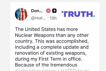 وكتب ترامب "بسبب عمليات الاختبار التي تُجريها دول أخرى، أصدرت تعليماتي لوزارة الحرب بالبدء في اختبار أسلحتنا النووية بالمثل، ستبدأ هذه العملية على الفور"، مضيفاً: "روسيا تأتي في المرتبة الثانية، والصين في المرتبة الثالثة بفارق كبير، لكنها ستكون على قدم المساواة في غضون 5 سنوات".