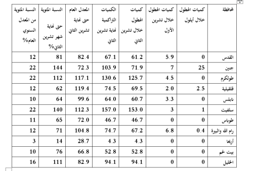 وقال مدير عام الأرصاد الجوية الفلسطينية عصام عيسى، إن ما ميز الفترة السابقة هو أن الأنظمة الجوية الفعالة التي أثرت في البلاد كانت حالات عدم استقرار جوي وليست منخفضات واسعة؛ بمعنى أن كميات الهطول كانت غزيرة وتتركز في مناطق دون أخرى.