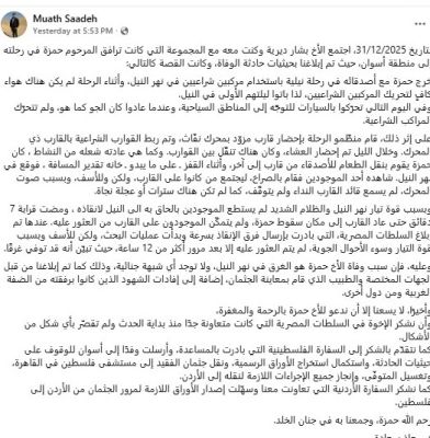 وعليه، فإن سبب وفاة الأخ حمزة هو الغرق في نهر النيل، ولا توجد أي شبهة جنائية، وذلك كما تم إبلاغنا من قبل الجهات المختصة والطبيب الذي قام بمعاينة الجثمان، إضافة إلى إفادات الشهود الذين كانوا برفقته من الضفة الغربية ومن دول أخرى.