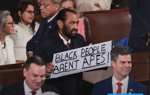 ورفع النائب الديمقراطي من أصل أفريقي، آل غرين، لافتة كتب عليها "السود ليسوا قروداً"، قبل أن يتم اخراجه من القاعة.